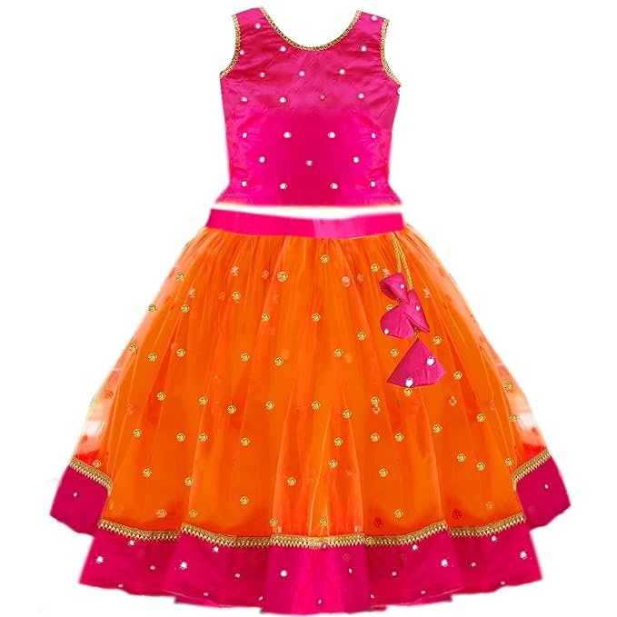 Buy Now Stanwells Kids Baby Girls Lehenga Choli – Looking for a stunning and traditional lehenga choli set for your little princess? The Stanwells Kids Orange & Magenta South Indian Baby Girls’ Mirror Work Lehenga Choli Set is a perfect blend of ethnic elegance and comfort, making it an ideal choice for festivals, weddings, birthday parties, and cultural celebrations. Designed with bright colors, intricate mirror work, and premium-quality fabric, this outfit ensures that your little one shines like a star at every special event.